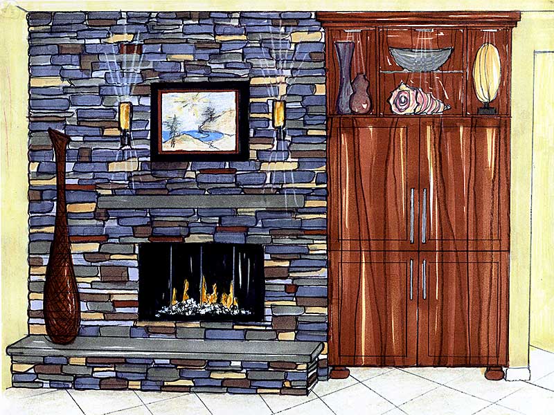 and modernize the fireplace, a cantilevered mantel and ledgestone